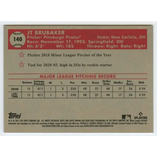 2021 Topps Chrome Platinum Anniversary #140 JT Brubaker NM-MT RC Rookie Pittsburgh Pirates Baseball Card