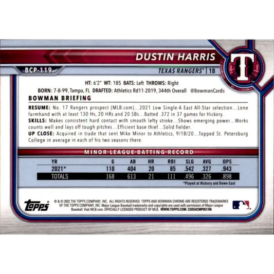 2022 Bowman Chrome Prospects #BCP-119 Dustin Harris NM-MT Texas Rangers Baseball Card