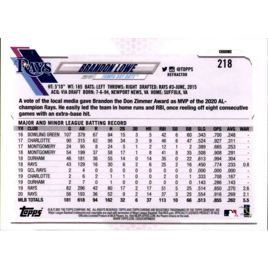 2021 Topps Chrome Refractor #218 Brandon Lowe NM-MT Tampa Bay Rays Baseball Card