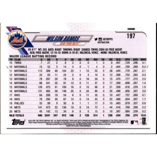 2021 Topps Chrome Refractor #197 Wilson Ramos NM-MT New York Mets Baseball Card