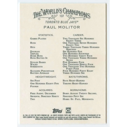 2022 Topps Allen and Ginter #137 Paul Molitor NM-MT Toronto Blue Jays Baseball Card