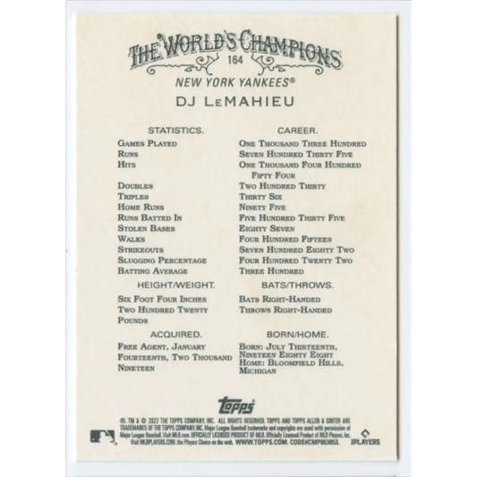 2022 Topps Allen and Ginter #164 DJ LeMahieu NM-MT New York Yankees Baseball Card