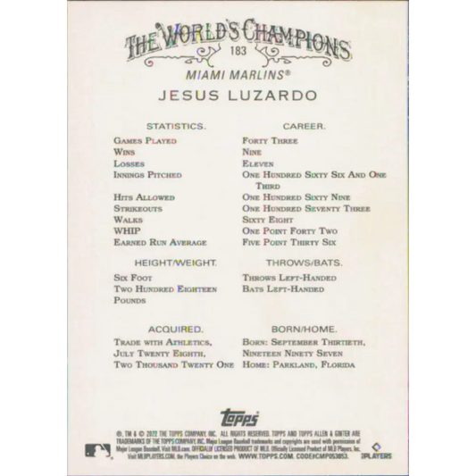 2022 Topps Allen and Ginter #183 Jesus Luzardo NM-MT Miami Marlins Baseball Card