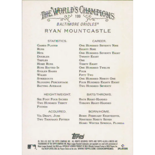 2022 Topps Allen and Ginter #199 Ryan Mountcastle NM-MT Baltimore Orioles Baseball Card