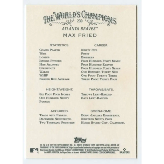 2022 Topps Allen and Ginter #230 Max Fried NM-MT Atlanta Braves Baseball Card