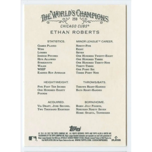 2022 Topps Allen and Ginter #259 Ethan Roberts NM-MT RC Rookie Chicago Cubs Baseball Card