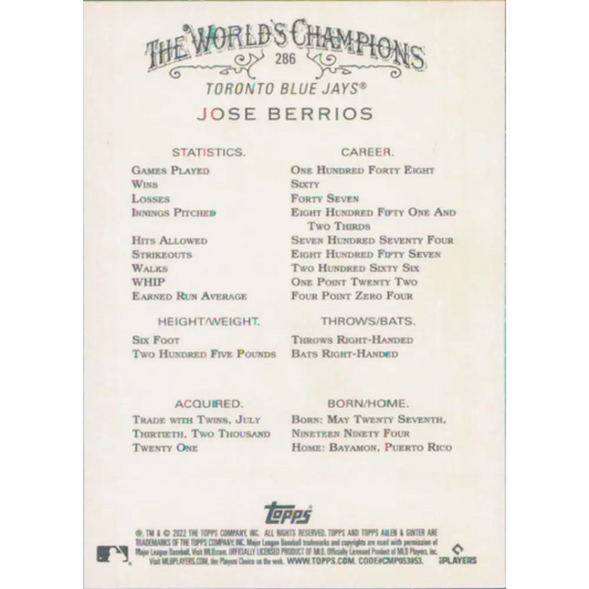 2022 Topps Allen and Ginter #286 Jose Berrios NM-MT Toronto Blue Jays Baseball Card