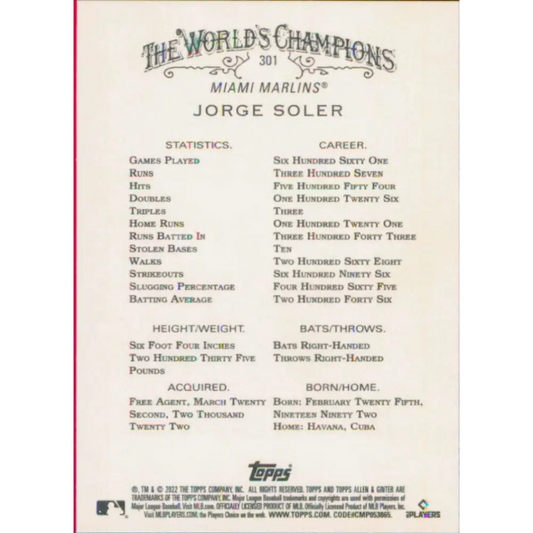 2022 Topps Allen and Ginter #301 Jorge Soler NM-MT Miami Marlins Baseball Card