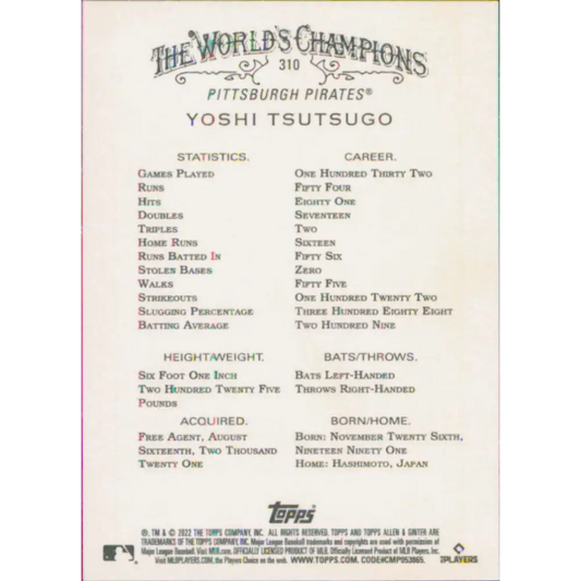 2022 Topps Allen and Ginter #310 Yoshi Tsutsugo NM-MT Pittsburgh Pirates Baseball Card
