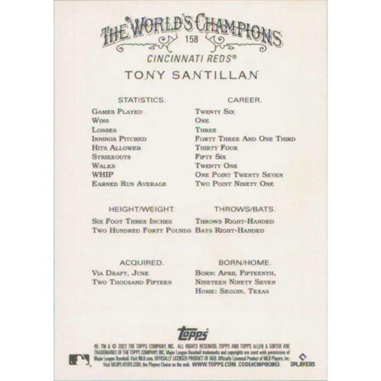 2022 Topps Allen and Ginter #158 Tony Santillan NM-MT RC Rookie Cincinnati Reds Baseball Card