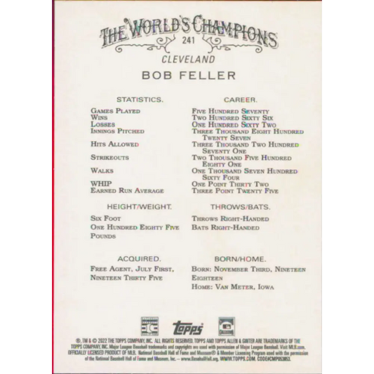 2022 Topps Allen and Ginter #241 Bob Feller NM-MT Cleveland Guardians Baseball Card