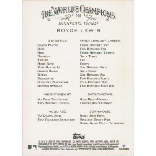 2022 Topps Allen and Ginter #290 Royce Lewis NM-MT RC Rookie Minnesota Twins Baseball Card