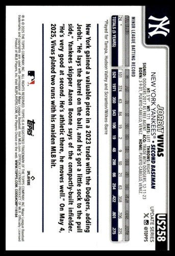 2025 Topps Update #US258 Jorbit Vivas NM-MT RC Rookie Yankees ID:80038