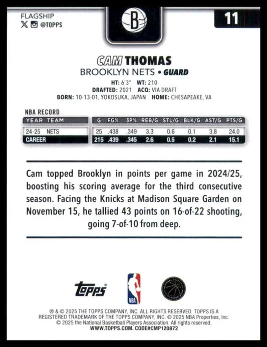 2025-26 Topps Cam Thomas #11 Brooklyn Nets Basketball Card NBA Sports