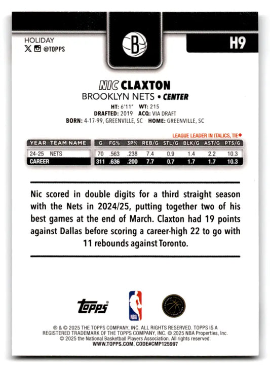 2025-26 Topps Holiday #H9 Nic Claxton NM Near Mint Nets ID:79820