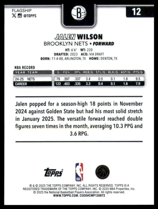 2025-26 Topps Jalen Wilson #12 Brooklyn Nets Basketball Card NBA Sports