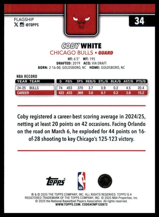 2025-26 Topps Coby White #34 Chicago Bulls Basketball Card NBA Sports