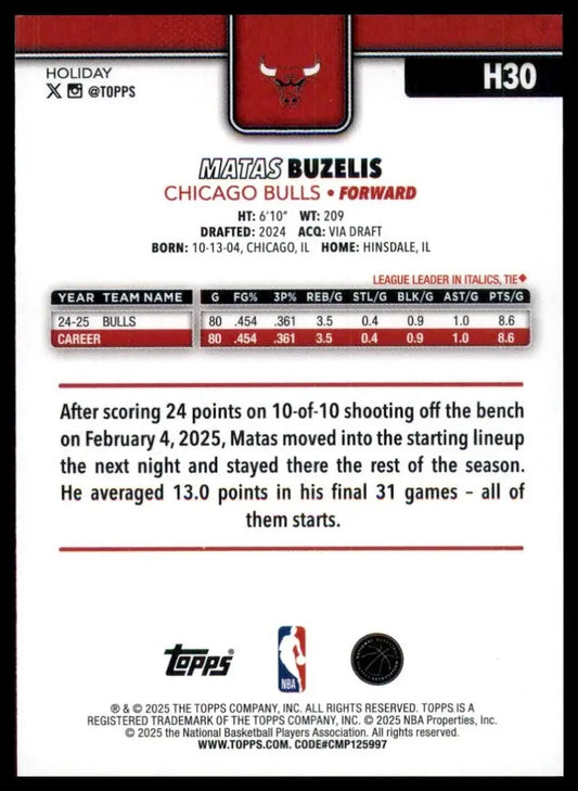 2025-26 Topps Holiday Glitter Matas Buzelis #H30 Chicago Bulls Basketball Card