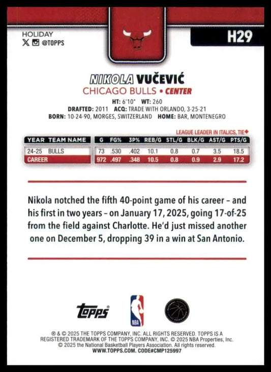 2025-26 Topps Holiday Nikola Vucevic #H29 Chicago Bulls Basketball Card NBA