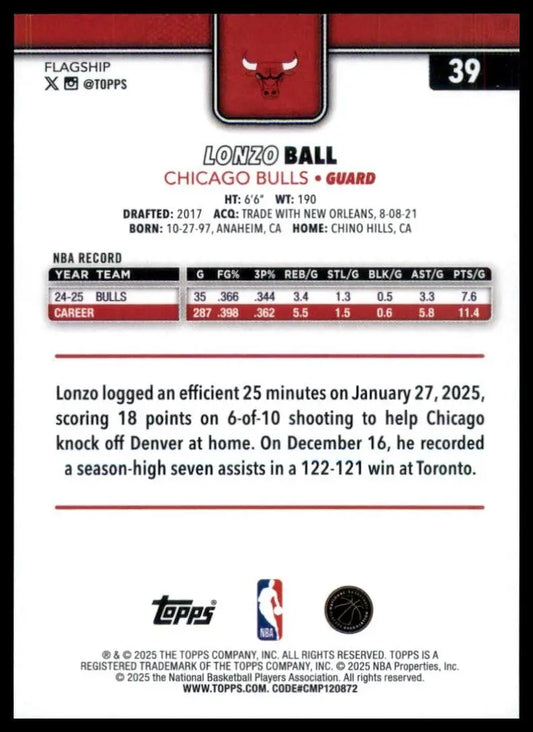 2025-26 Topps Lonzo Ball #39 Chicago Bulls Basketball Card NBA Sports