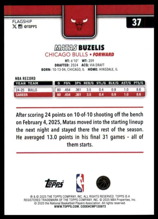 2025-26 Topps Matas Buzelis #37 Chicago Bulls Basketball Card NBA Sports