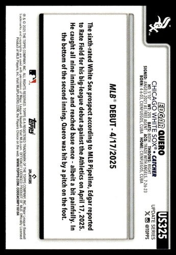2025 Topps Update #US325 Edgar Quero NM-MT White Sox Rookie Debut ID:80047