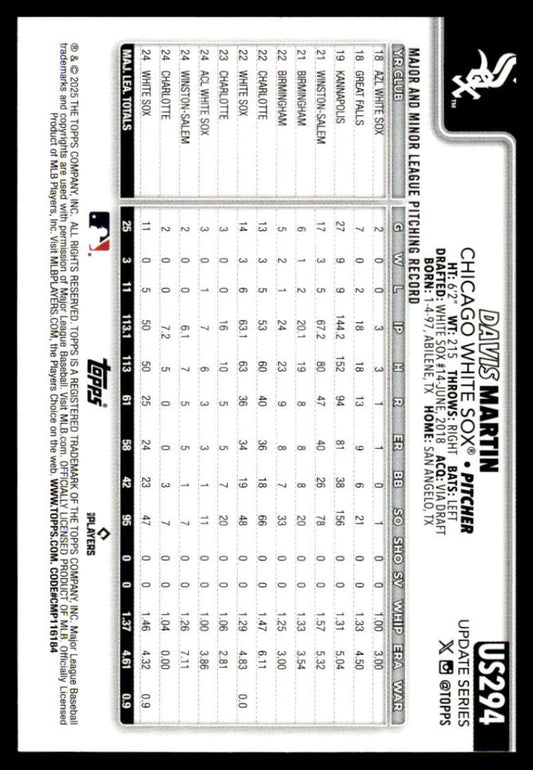 2025 Topps Update #US294 Davis Martin NM-MT White Sox ID:80044