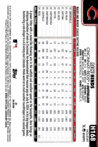 2025 Topps Holiday #H168 Rece Hinds NM-MT RC Rookie Reds ID:79973