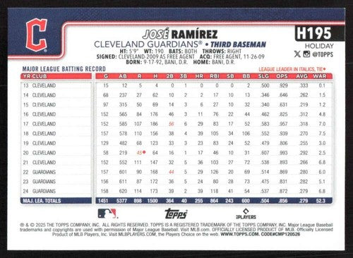 2025 Topps Holiday #H195 Jose Ramirez NM-MT Guardians ID:79993