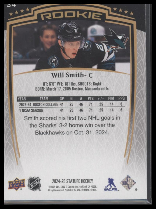 2024-25 Upper Deck Stature Will Smith #34 SN,RC #/999 San Jose Sharks