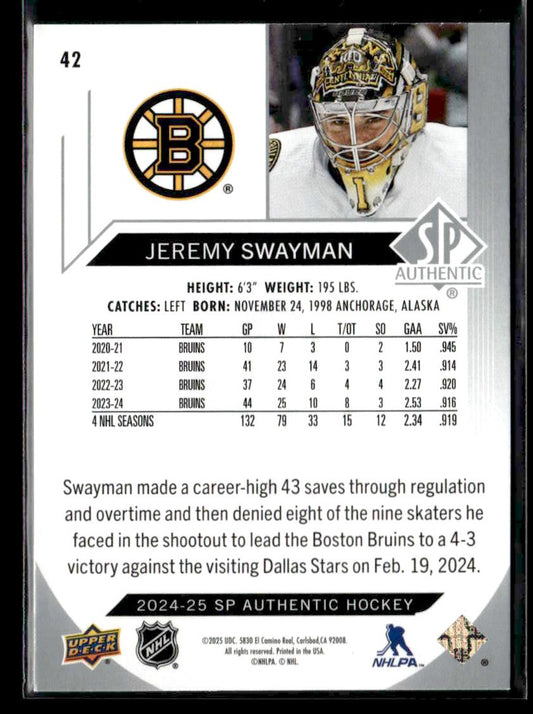 2024-25 SP Authentic Jeremy Swayman #42 Boston Bruins