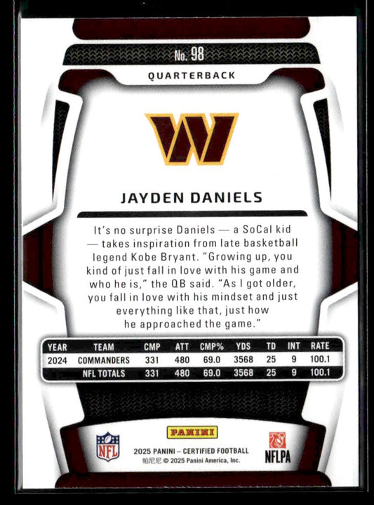 2025 Panini Certified Jayden Daniels #98 Washington Commanders