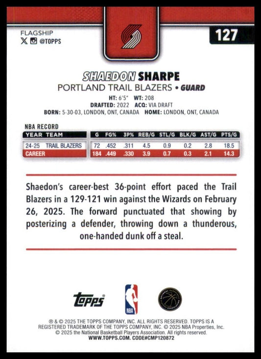 2025-26 Topps Shaedon Sharpe #127 Portland Trail Blazers Basketball Card NBA