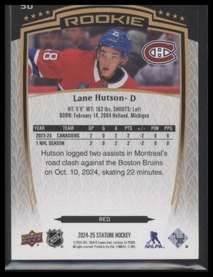 2024-25 Upper Deck Stature Lane Hutson #50 Red SN #/249 Montreal Canadiens