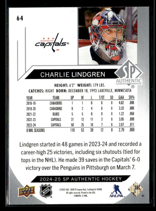 2024-25 SP Authentic Charlie Lindgren #64 Washington Capitals