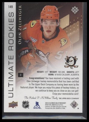 2024-25 UD Ult Collection Olen Zellweger #149 Ult Rookies Jersey #/499 Ducks