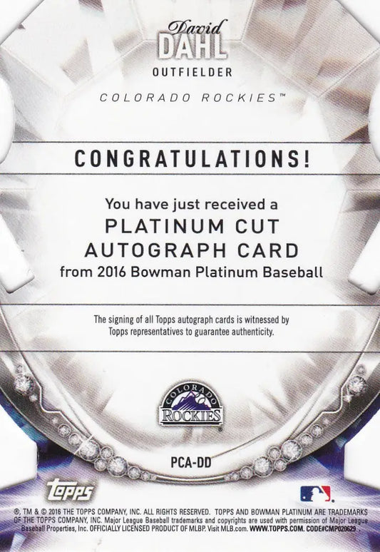 2016 TOPPS #PCA-DD DAVID DAHL AUTO 16/26 DIE CUT- COLORADO ROCKIES