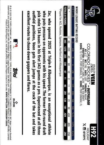 2025 Topps Holiday Zac Veen Rookie #H92 Colorado Rockies Baseball Card MLB Sport