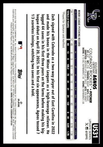 2025 Topps Update #US31 Zach Agnos NM-MT RC Rookie Rockies ID:80009