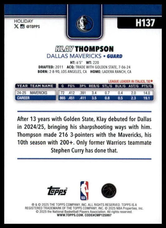 2025-26 Topps Holiday Klay Thompson #H137 Dallas Mavericks Basketball Card NBA