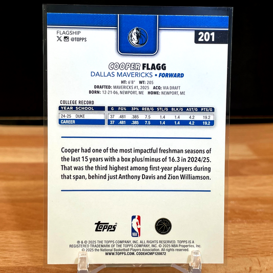 2025-26 Topps Basketball Cooper Flagg Rookie RC #201 Dallas Mavericks Base