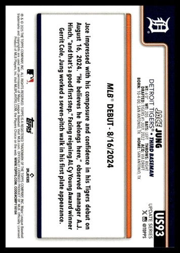 2025 Topps Update #US93 Jace Jung NM-MT Tigers Rookie Debut ID:80016