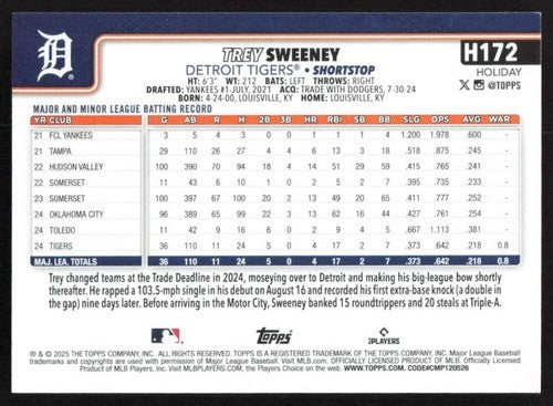 2025 Topps Holiday #H172 Trey Sweeney NM-MT RC Rookie Tigers ID:79975