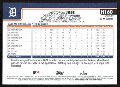 2025 Topps Holiday #H160 Jackson Jobe NM-MT RC Rookie Tigers ID:79967