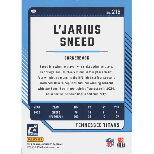 2024 Donruss #216 L'Jarius Sneed NM-MT Tennessee Titans Football Card