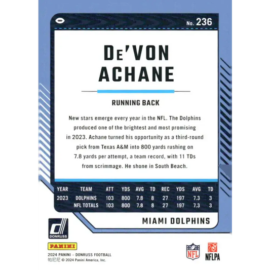 2024 Donruss #236 De'Von Achane NM-MT Miami Dolphins Football Card