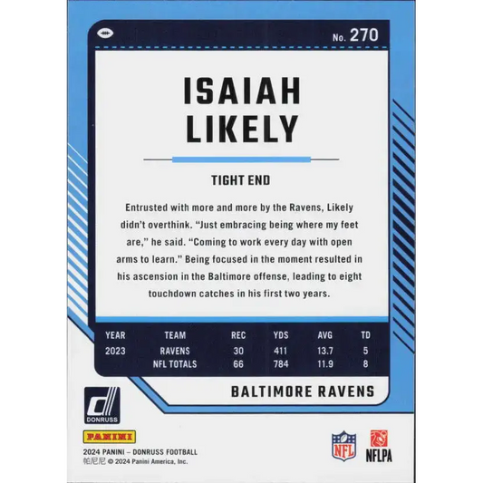 2024 Donruss #270 Isaiah Likely NM-MT Baltimore Ravens Football Card