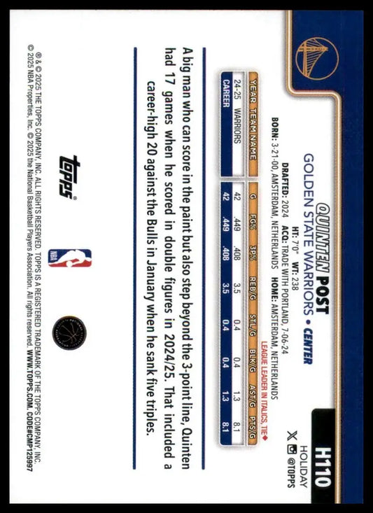 2025-26 Topps Holiday Quinten Post #H110 Golden State Warriors Basketball Card
