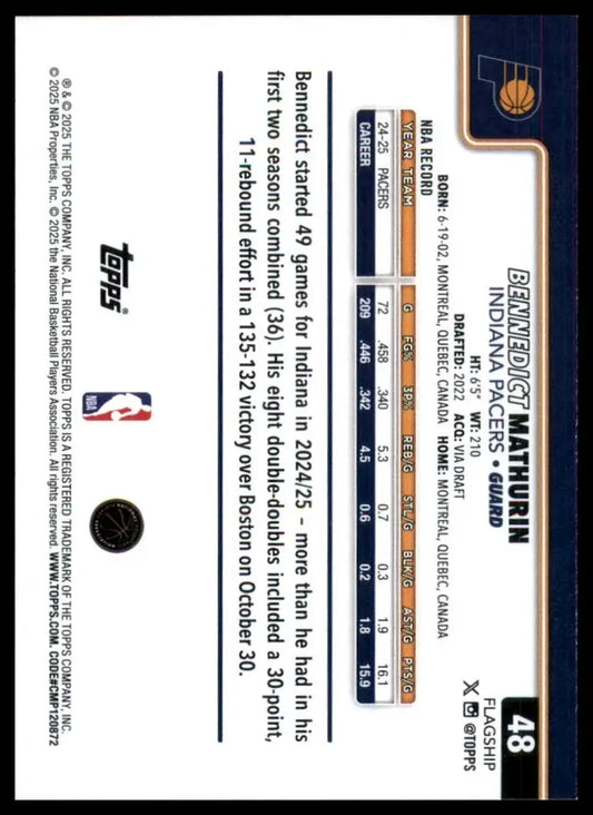 2025-26 Topps Bennedict Mathurin #48 Indiana Pacers Basketball Card NBA Sports