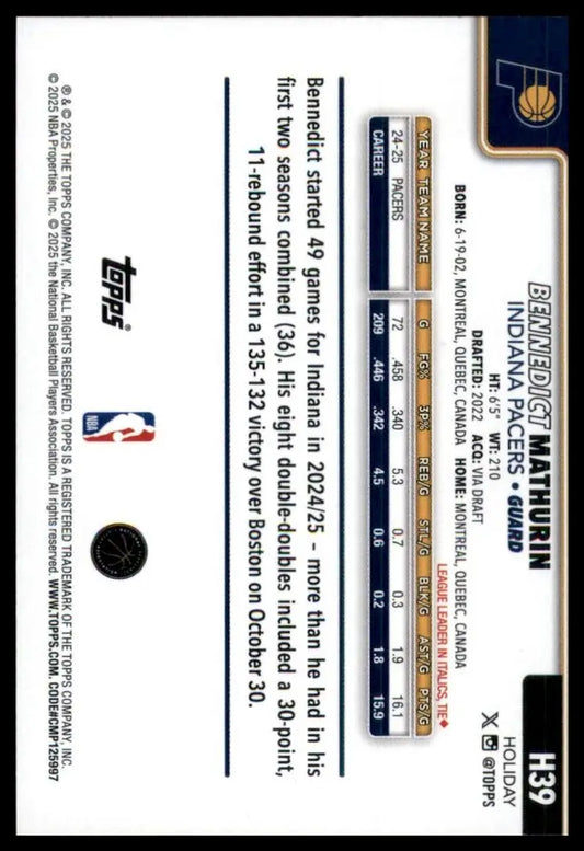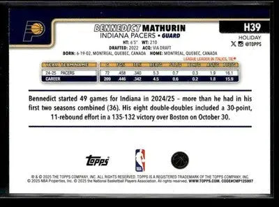 2025-26 Topps Holiday Bennedict Mathurin #H39 Indiana Pacers